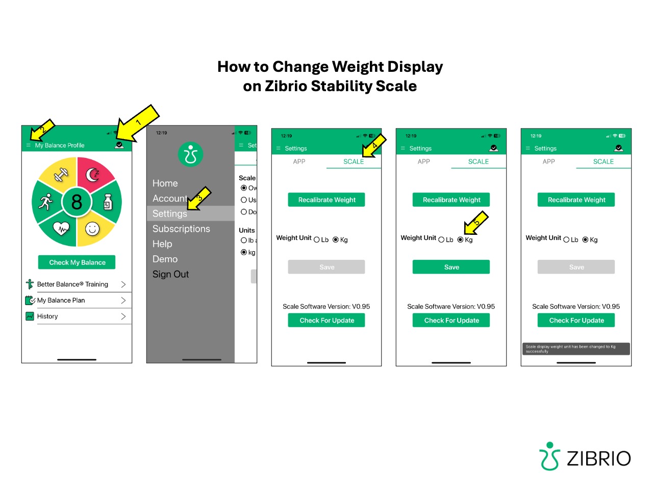 The Zibrio Stability scale can display weight in either pounds or kilograms. By default, this is set to pounds, but can be changed via the Zibrio BalanceCoach app.